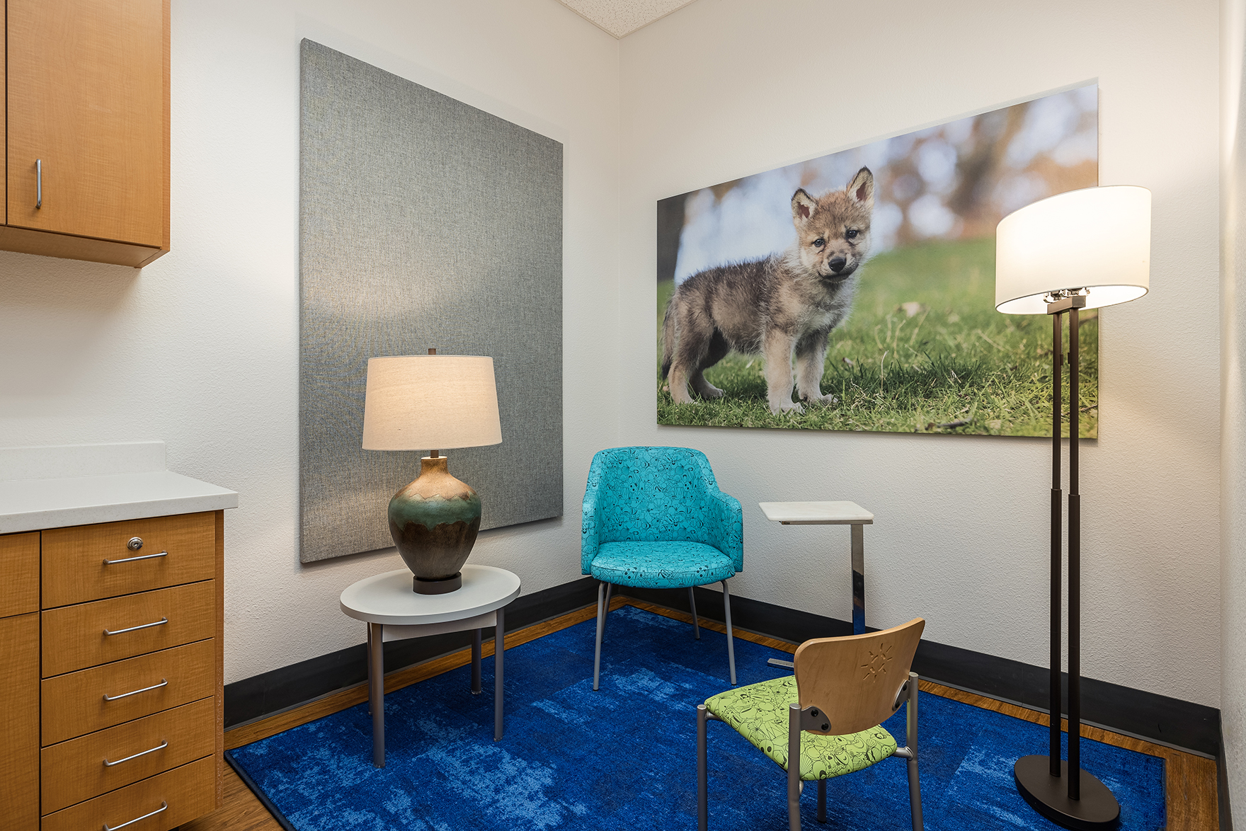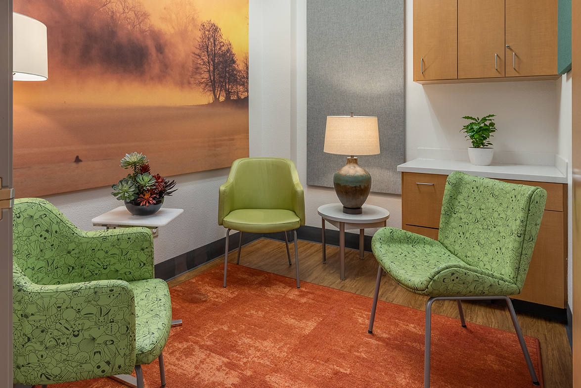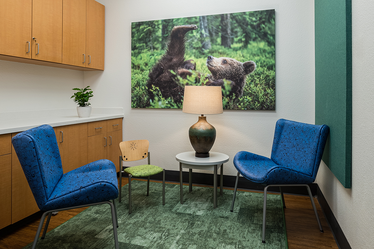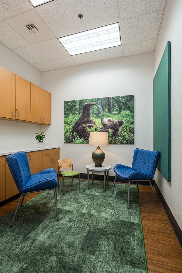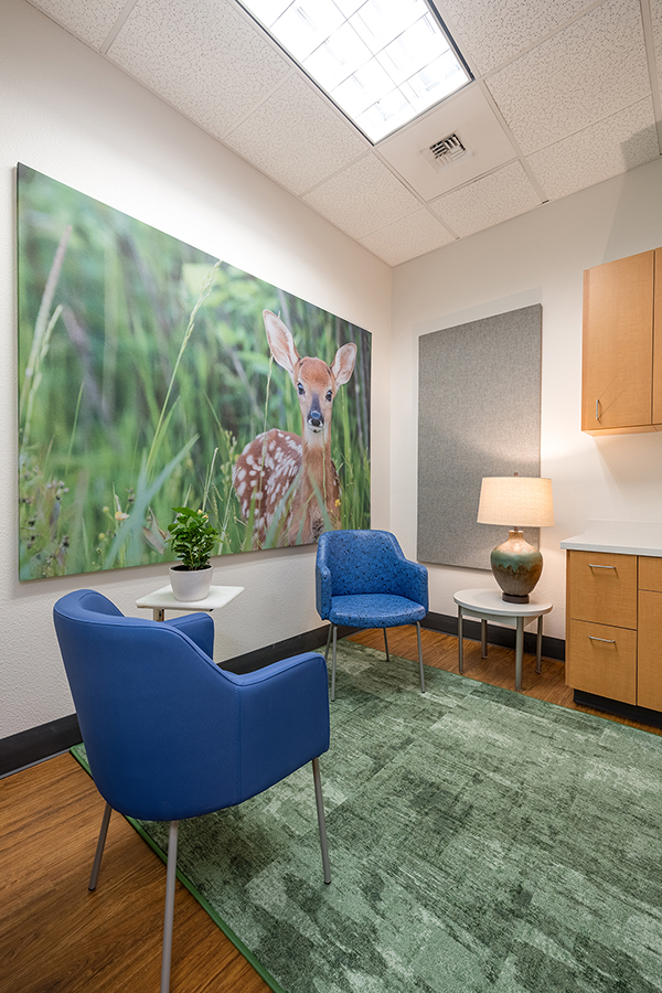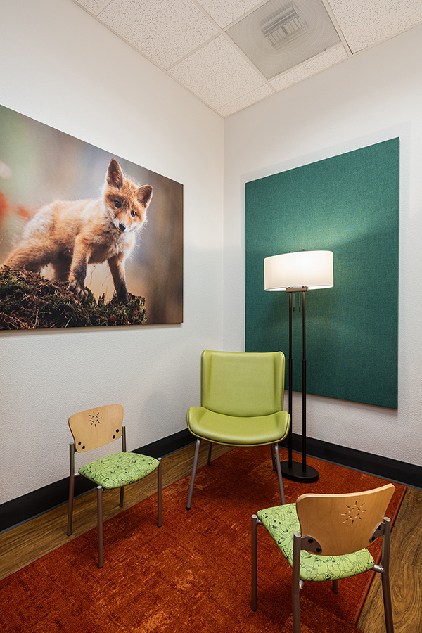 Designing a therapeutic environment for young patients required creating a space that feels safe, engaging, and supportive. The goal was to make the clinic approachable and calming, while addressing the unique needs of pediatric behavioral health. Large acoustic panels between rooms provide privacy and a sense of security, while also serving as a canvas for playful imagery of baby animals and nature. Colorful patterns and thoughtfully selected materials offer gentle sensory stimulation and visual interest, helping to engage, disarm, and delight children. Durable, easy-to-clean finishes ensure the space remains functional and inviting over time. Photographic artwork of particular significance to the client adds a personal touch, fostering connection and warmth for children and families alike.
