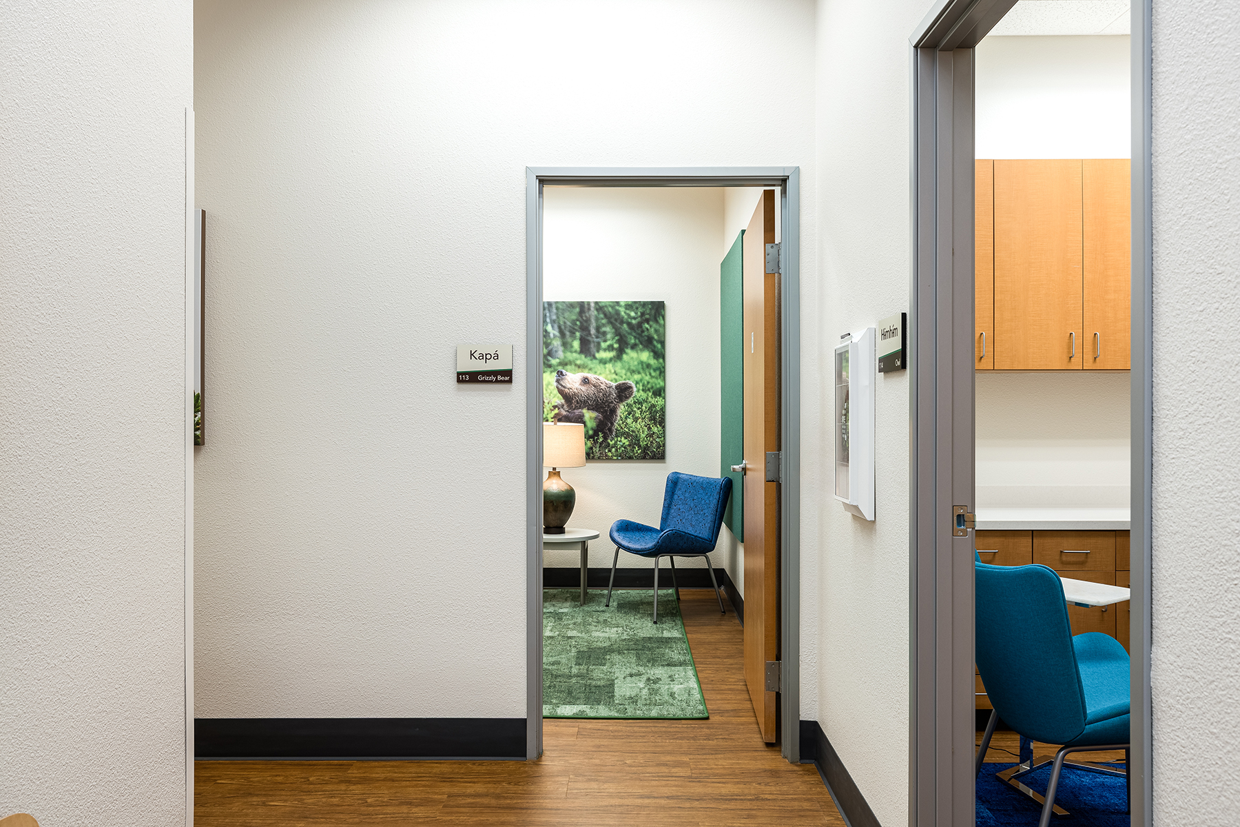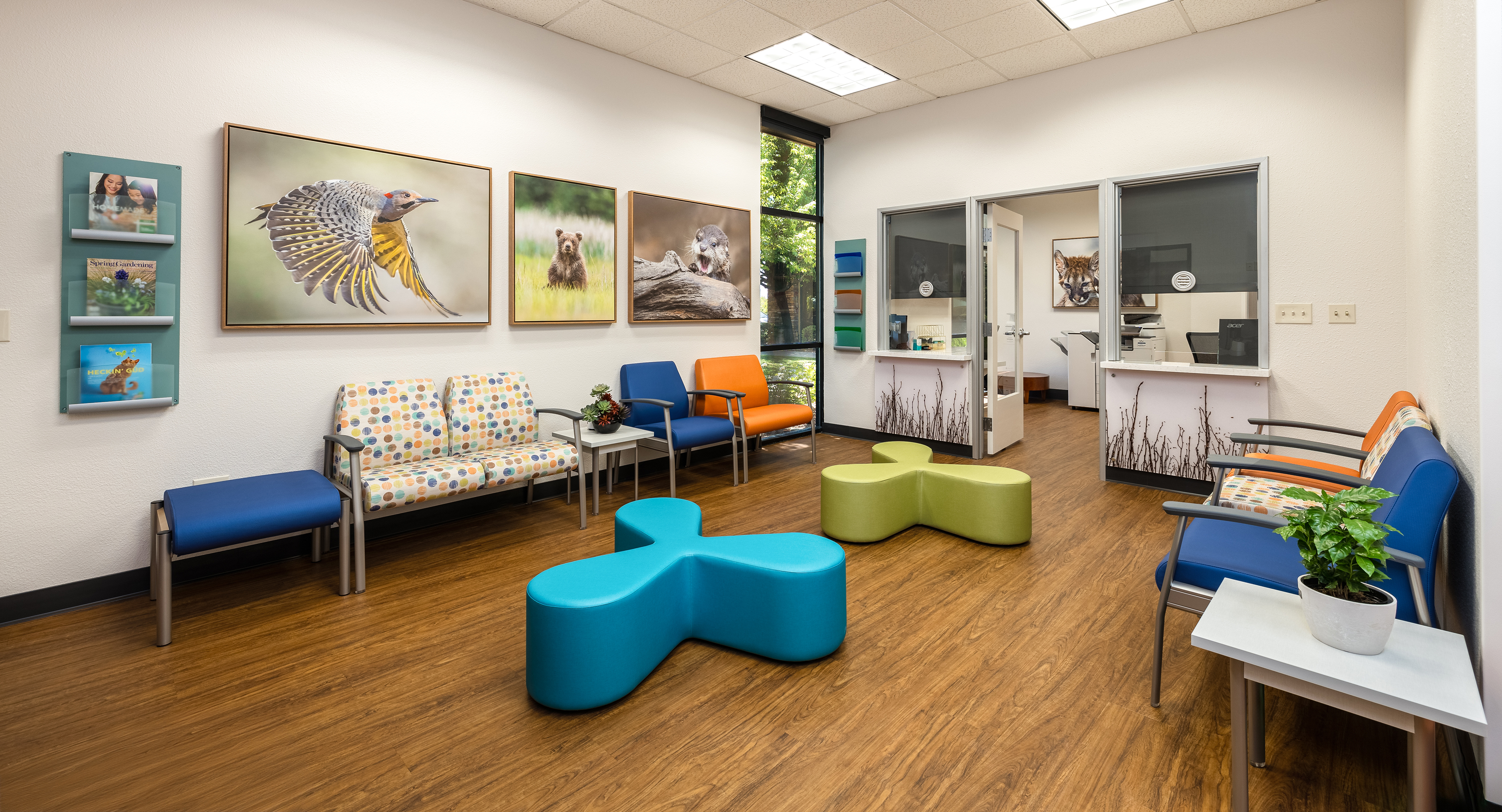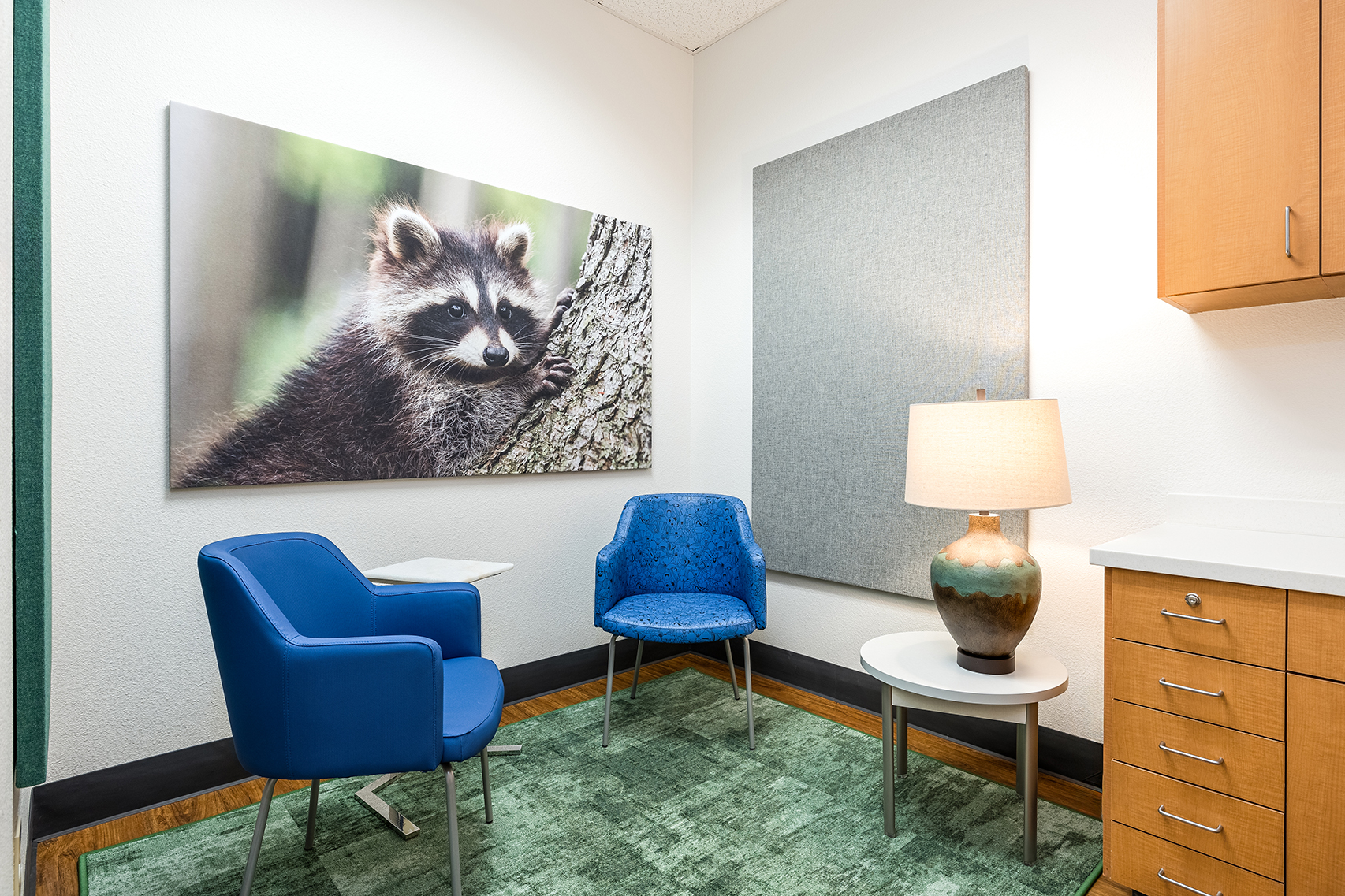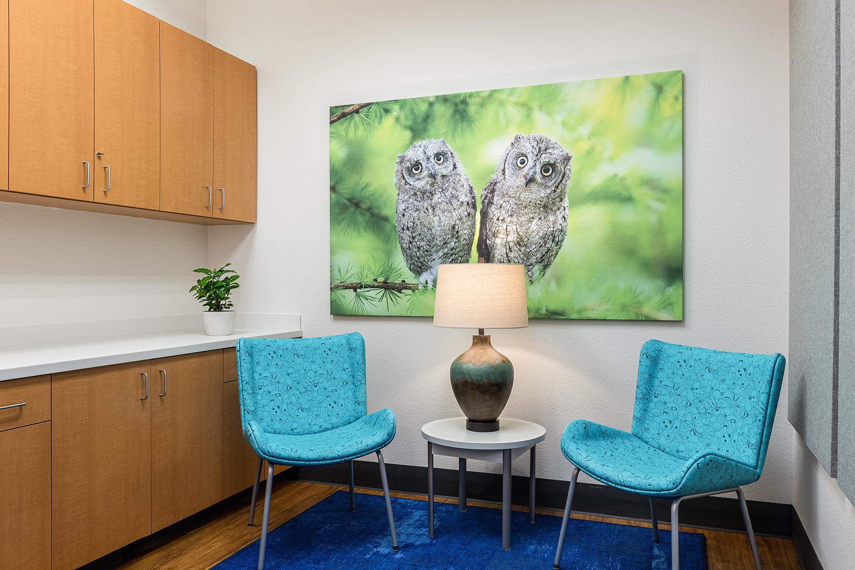 Designing a therapeutic environment for young patients required creating a space that feels safe, engaging, and supportive. The goal was to make the clinic approachable and calming, while addressing the unique needs of pediatric behavioral health. Large acoustic panels between rooms provide privacy and a sense of security, while also serving as a canvas for playful imagery of baby animals and nature. Colorful patterns and thoughtfully selected materials offer gentle sensory stimulation and visual interest, helping to engage, disarm, and delight children. Durable, easy-to-clean finishes ensure the space remains functional and inviting over time. Photographic artwork of particular significance to the client adds a personal touch, fostering connection and warmth for children and families alike.