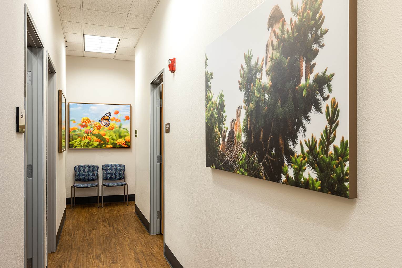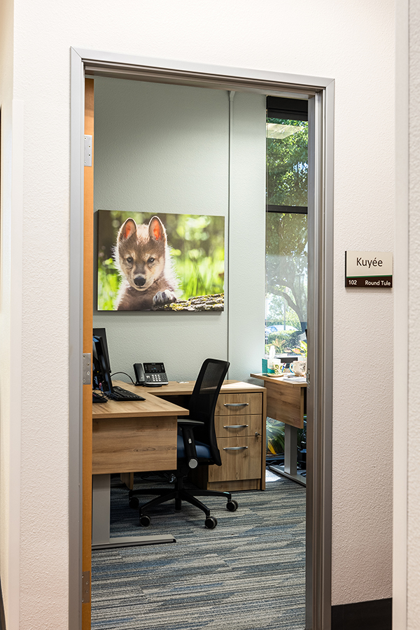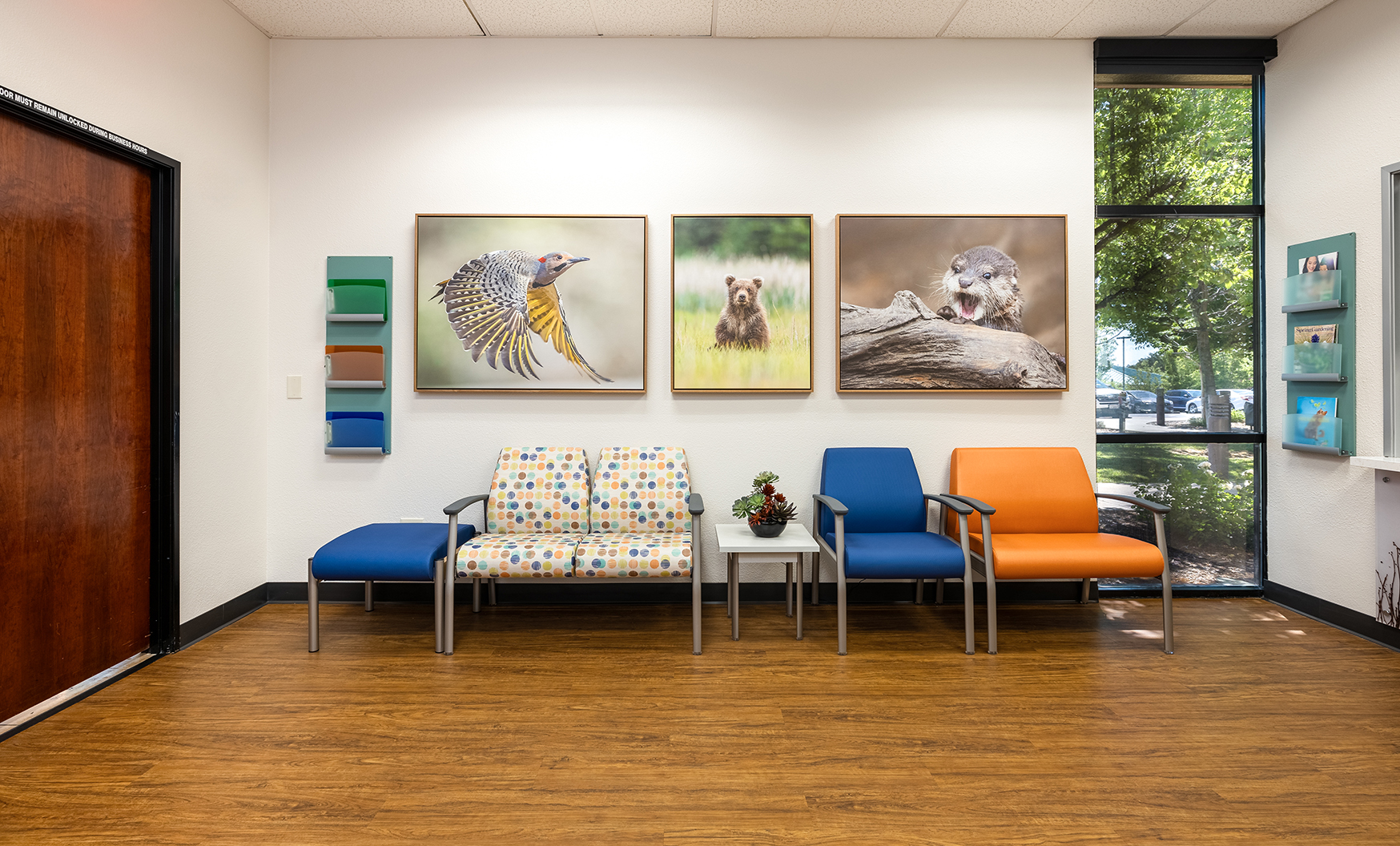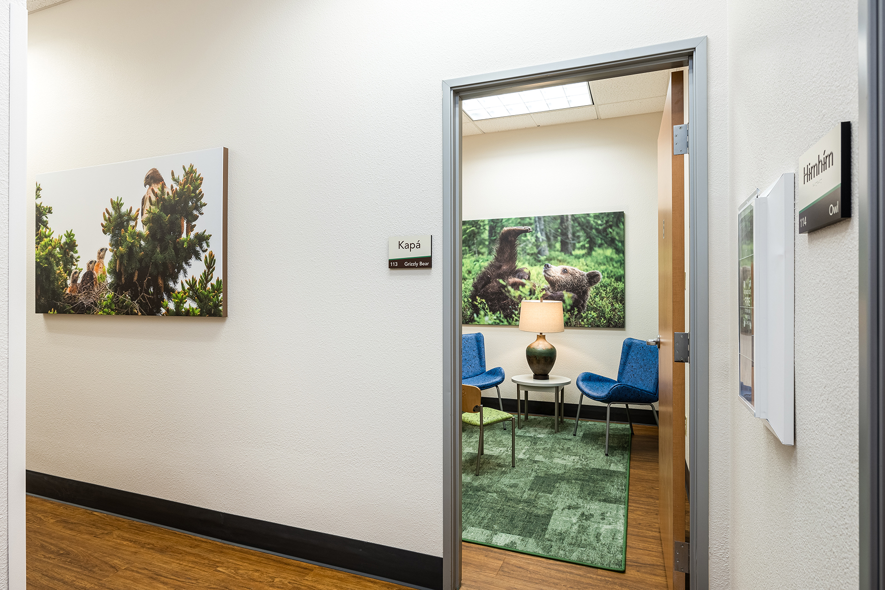 Designing a therapeutic environment for young patients required creating a space that feels safe, engaging, and supportive. The goal was to make the clinic approachable and calming, while addressing the unique needs of pediatric behavioral health. Large acoustic panels between rooms provide privacy and a sense of security, while also serving as a canvas for playful imagery of baby animals and nature. Colorful patterns and thoughtfully selected materials offer gentle sensory stimulation and visual interest, helping to engage, disarm, and delight children. Durable, easy-to-clean finishes ensure the space remains functional and inviting over time. Photographic artwork of particular significance to the client adds a personal touch, fostering connection and warmth for children and families alike.