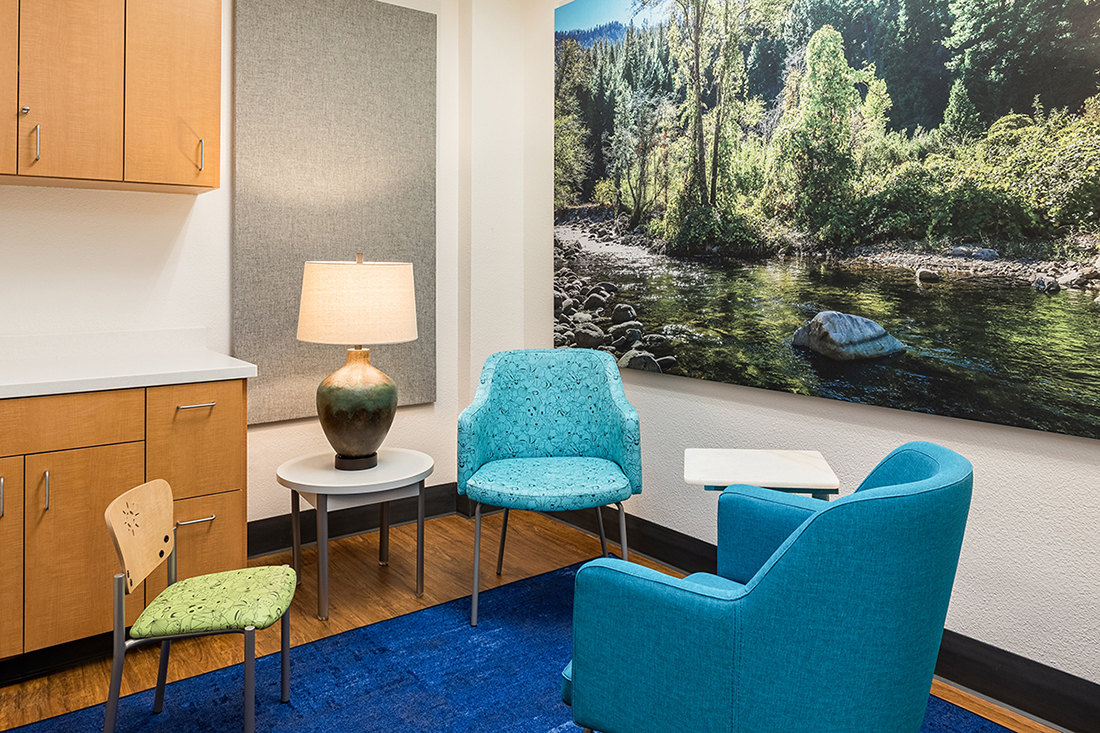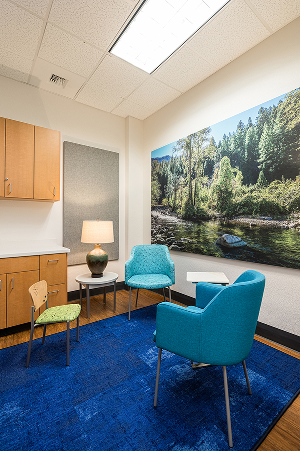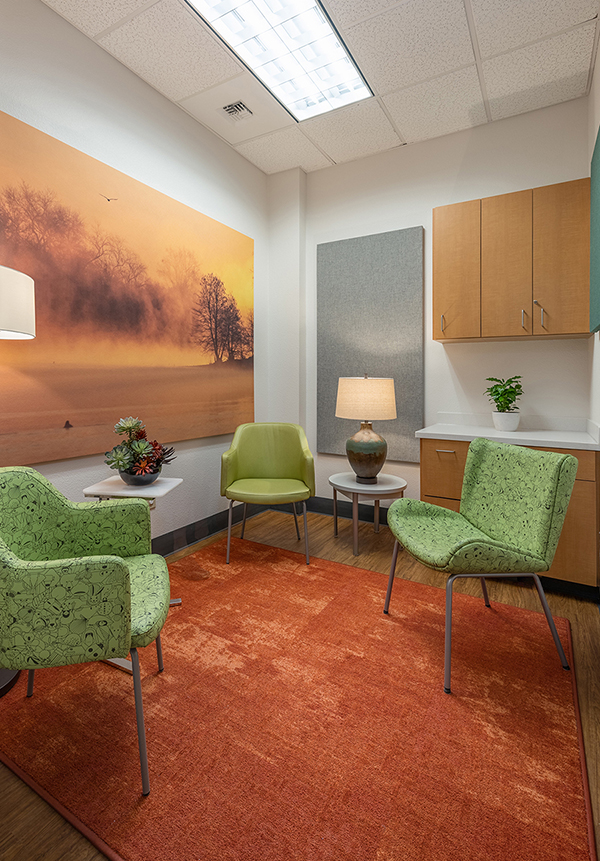 SCOPE: A remodel of an existing medical space from general practitioner to therapy offices. Selection of materials & finishes, furniture and artwork; procurement and installation of furnishings and custom artwork.
